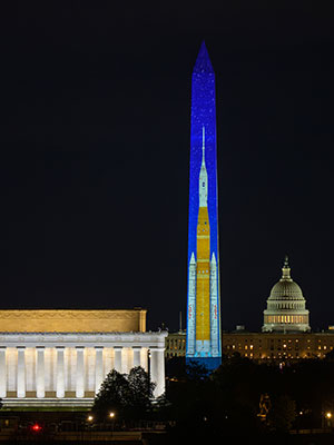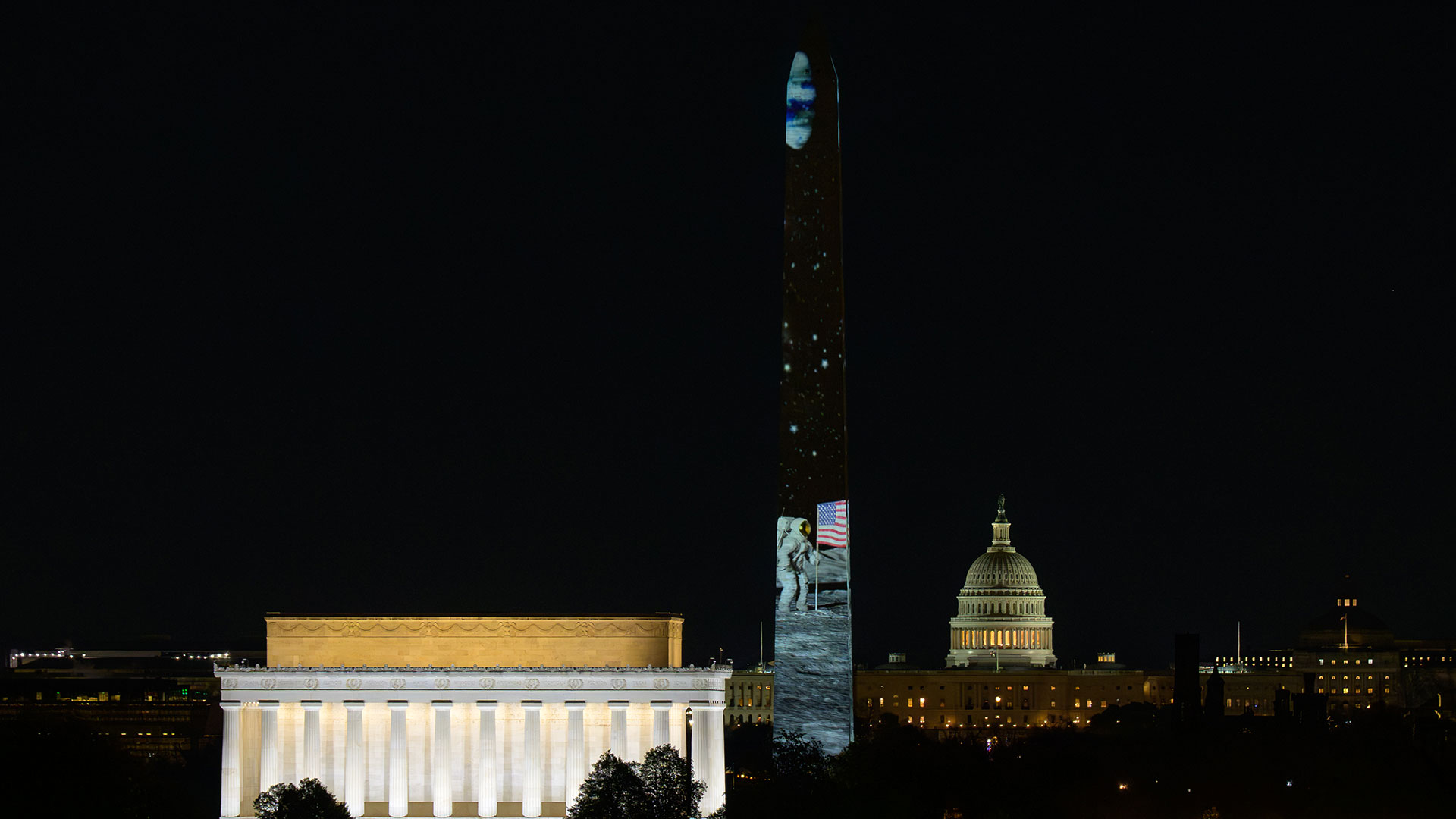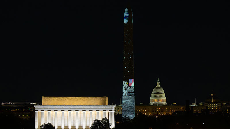 In addition to scenes showing the Apollo-era Saturn V and Artemis Program Space Launch System (SLS), the "Illumination of America" map projection show on the Washington Monument included astronauts walking the moon and deploying the United States flag. (NASA/Bill Ingalls)