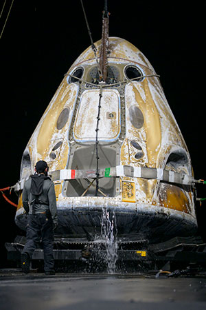 SpaceX's Crew Dragon Endeavour, carrying the four members of Crew-11, is hoisted onto a recovery ship on Thursday, Jan. 15, 2026. The capsule's safe landing came a few weeks early due to a medical issue with one of the crew members. (NASA/Bill Ingalls)