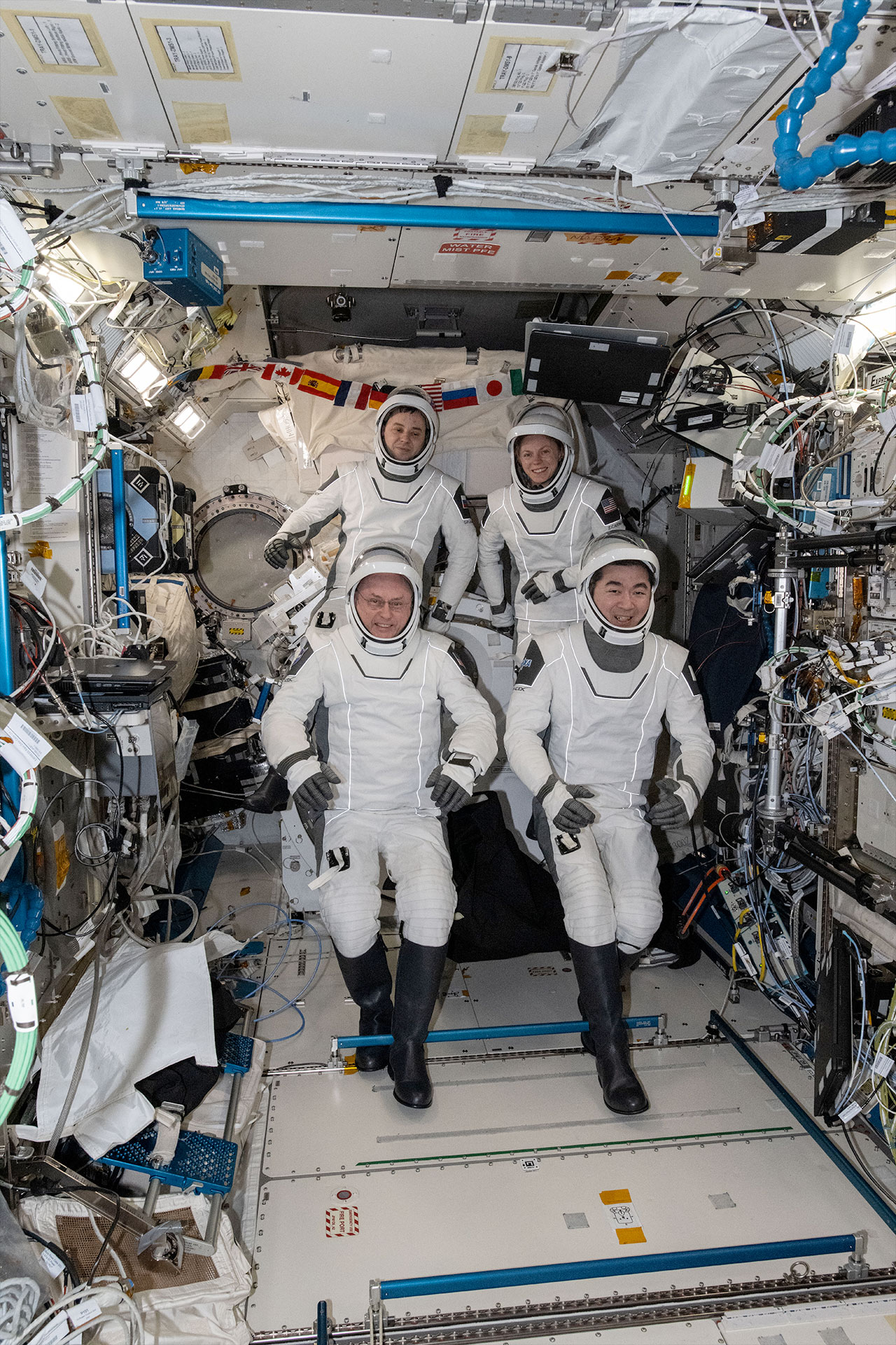 The four SpaceX Crew-11 members — Mike Fincke, Oleg Platonov, Zena Cardman and Kimiya Yui — gather during a suit verification check prior to their leaving the International Space Station. (NASA)