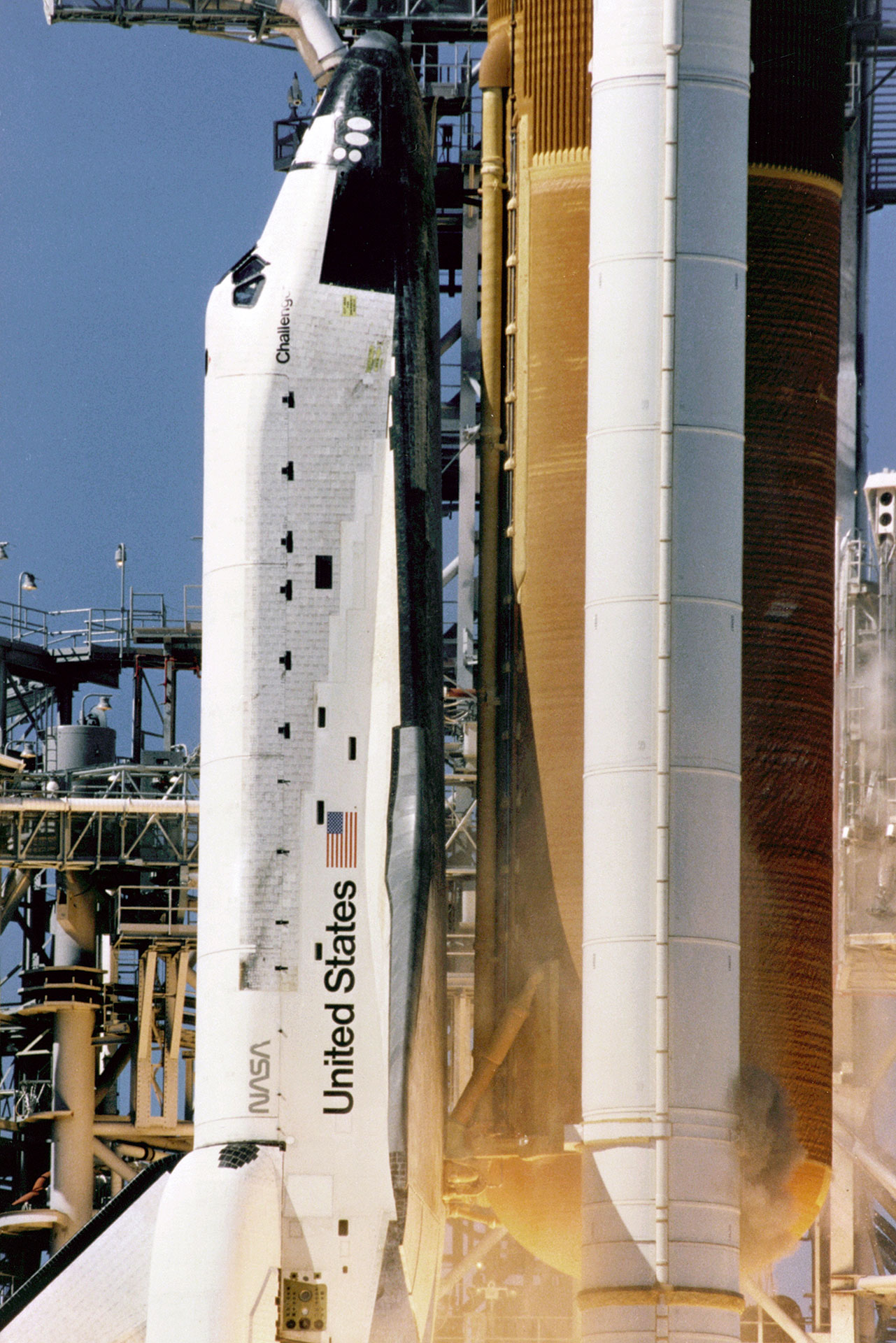 Close-up view of the liftoff of the space shuttle Challenger on its ill-fated last mission STS-51L. A cloud of grey-brown smoke can be seen on the right side of the solid rocket booster on a line directly across from the letter "U" in United States. This was the first visible sign that an SRB joint breach may have occurred, leading to the external tank (ET-26) being compromised during its ascent. (NASA)