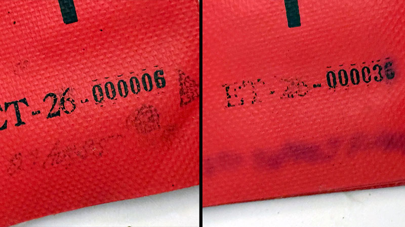 Close-up detail of two of the 18 shuttle "Remove Before Flight" tags purchased off eBay. All were marked "ET-26" with a serial number. Some included additional stamps and handwritten notations. Most of the latter, though, has bled into the fabric such that it can no longer be read. (collectSPACE) |