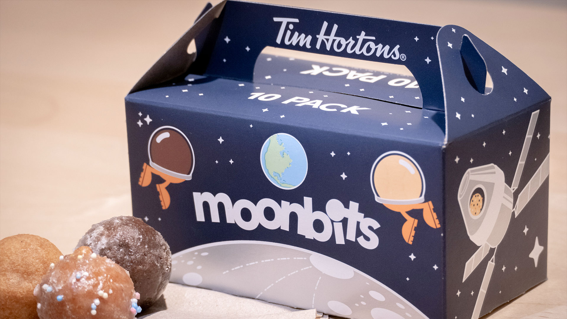 Tim Hortons' Moonbits 10-pack is decorated with illustrations of Timbits wearing Artemis pressure suits, as well as an Orion capsule, Earth and the moon. The box also includes information to excite customers about the milestone in international space exploration.