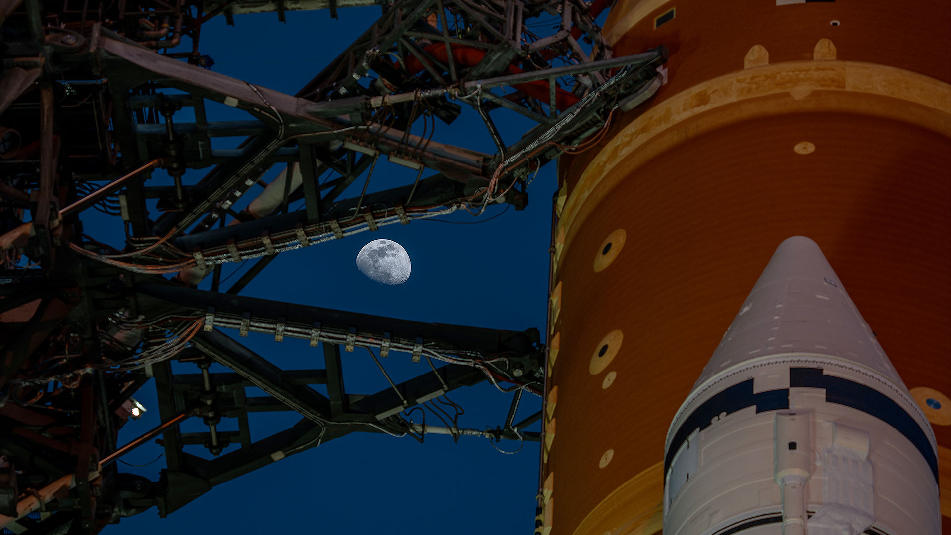 The moon is seen shining over the SLS (Space Launch System) and Orion spacecraft, atop the mobile launcher, ahead of the Feb. 2 to Feb. 3 Artemis II wet dress rehearsal at NASA Kennedy Space Center's Launch Pad 39B in Florida. (NASA/Brandon Hancock)