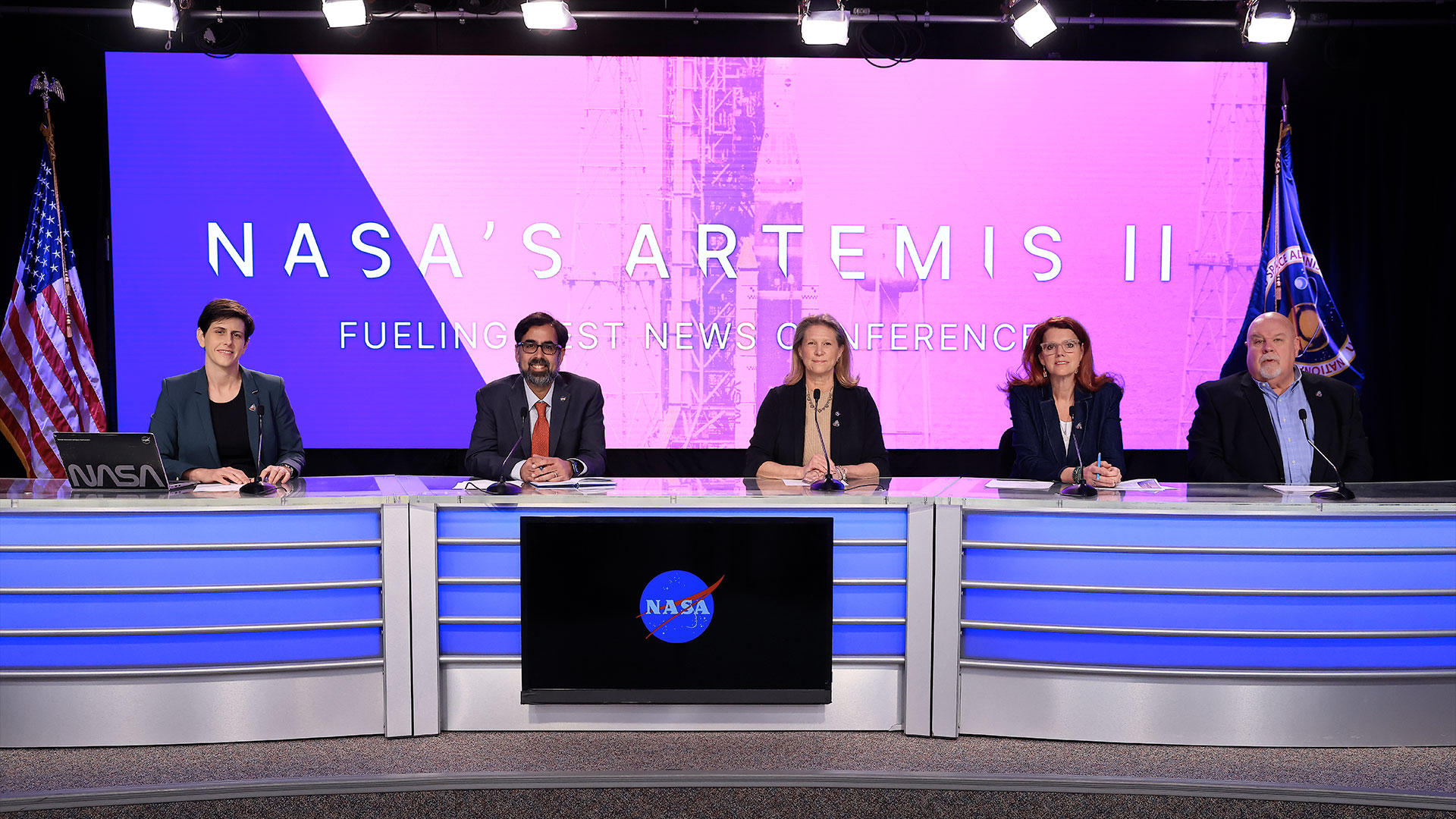 Rachel Kraft (at left), NASA public affairs; Amit Kshatriya, NASA associate administrator; Lori Glaze, acting associate administrator for exploration systems development; Charlie Blackwell-Thompson, Artemis II launch director and John Honeycutt, Artemis II mission management team chair discuss the completion of the Artemis II wet dress rehearsal at NASA's Kennedy Space Center in Florida, on Tuesday, Feb. 3, 2026. (NASA/Kim Shiflett)