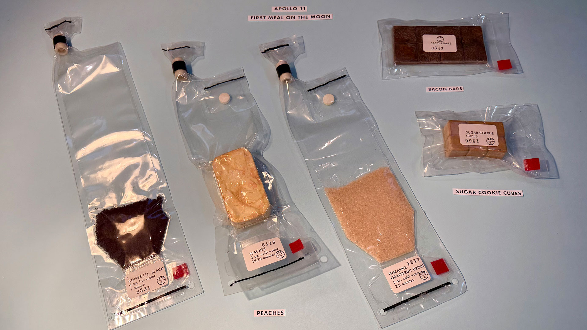 Coffee, peaches, pineapple-grapefruit drink, bacon bars and sugar cookie cubes — the first meal on the moon — can now be yours, as replicated by artist Ryan Nagata. (Ryan Nagata)