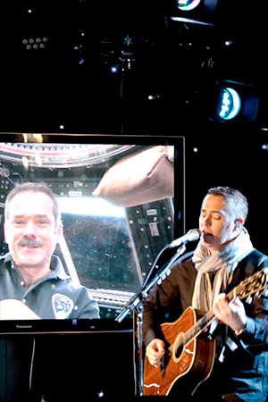 Astronaut Chris Hadfield (left) performs from on the International Space Station while Barenaked Ladies frontman Ed Robertson sings with his bandmates and a youth choir in Toronto, Canada, for the first Earth and space duet of an original song. (CBC Music)