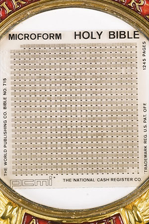 Three hundred of the approximately 1 by 1 inch (2.5 by 2.5 centimeter) microfilm bibles flew aboard NASA's February 1971 Apollo 14 mission, the third of six flights to land men on the moon.