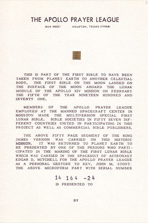The small squares, each printed with the 1,245 pages and 773,746 words of the Christian holy scriptures, were not an official cargo of the space agency. Rather, they were carried by moonwalker Edgar Mitchell as a favor to Stout and the Apollo Prayer League, a group of faithful NASA employees, who, led by Stout, prayed for the safety of the astronauts.