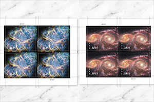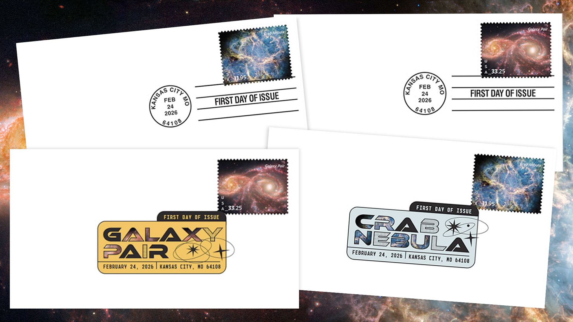 The U.S. Postal Service (USPS) on Tuesday, Feb. 24, 2026, issued Priority Mail stamps featuring images of a nebula and galaxies from the James Webb Space Telescope. (USPS/NASA/collectSPACE)