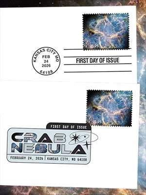 To commemorate the release, the postal service has prepared first day covers affixed with either the Priority Mail or Priority Mail Express stamps and postmarked in Kansas City, Missouri with Tuesday's date. There are two different cancellation devices: a standard circular date ink stamp with four "killer bars" and a digital color postmark in either light and dark blue for "Crab Nebula" or orange and black for "Galaxy Pair."