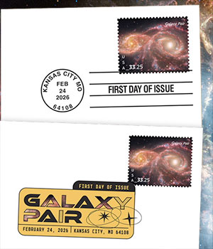 The $33.25 Priority Mail Express "Galaxy Pair" stamp reproduces a composite image assembled from Webb and Hubble Space Telescope infrared, visible and ultraviolet views of two interacting galaxies, IC 2163 and NGC 2207, located approximately 80 million light-years from Earth, The "Galaxy Pair" depicts the smaller spiral IC 2163 passing behind NGC 2207, the galaxy at right, millions of years ago.