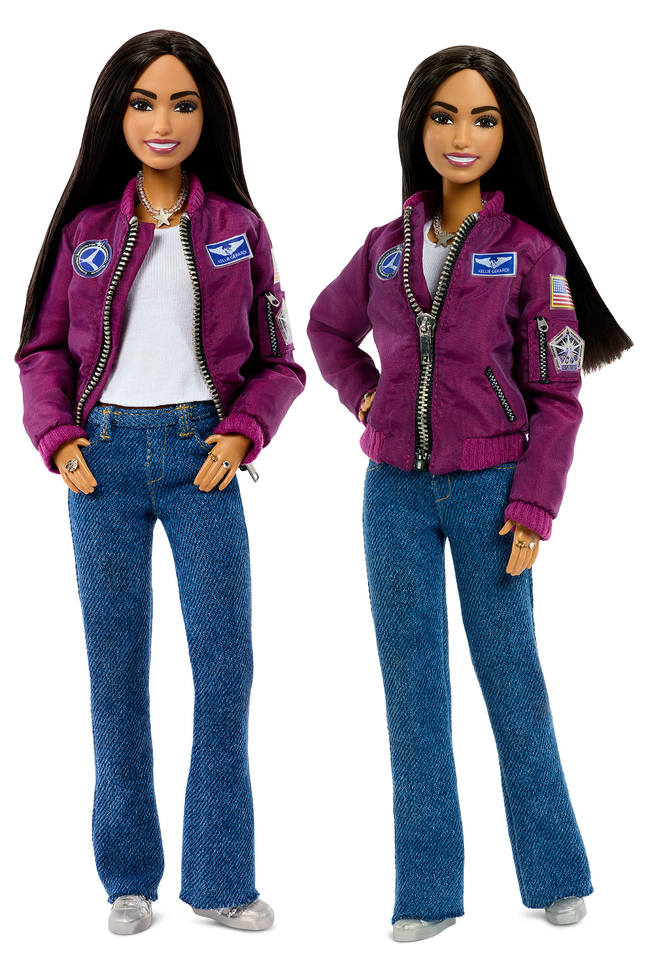 Gerardi's one-of-a-kind Barbie doll — Mattel produced it only for display rather than for sale — recreates her look and her outfit, including details like the design of her mission patches sewn to her purple jacket.