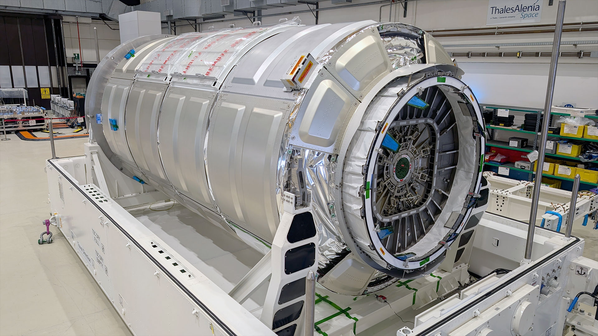 Northrop Grumman's NG-24 Cygnus XL cargo spacecraft, the S.S. Steven R. Nagel, as seen in Turin, Italy before being shipped off to Cape Canaveral, Florida for its launch. (Thales Alenia)