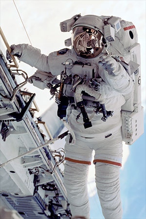 Astronaut Dan Barry, STS-105 mission specialist, traverses along space shuttle Discovery's payload bay backdropped by Earth while on a spacewalk on Aug. 16, 2001. (NASA) |