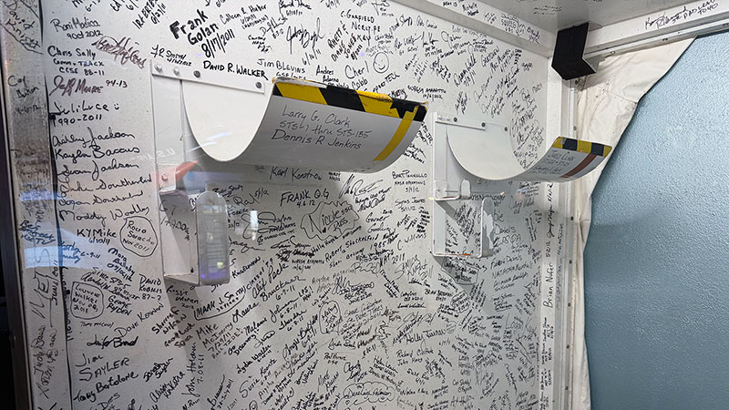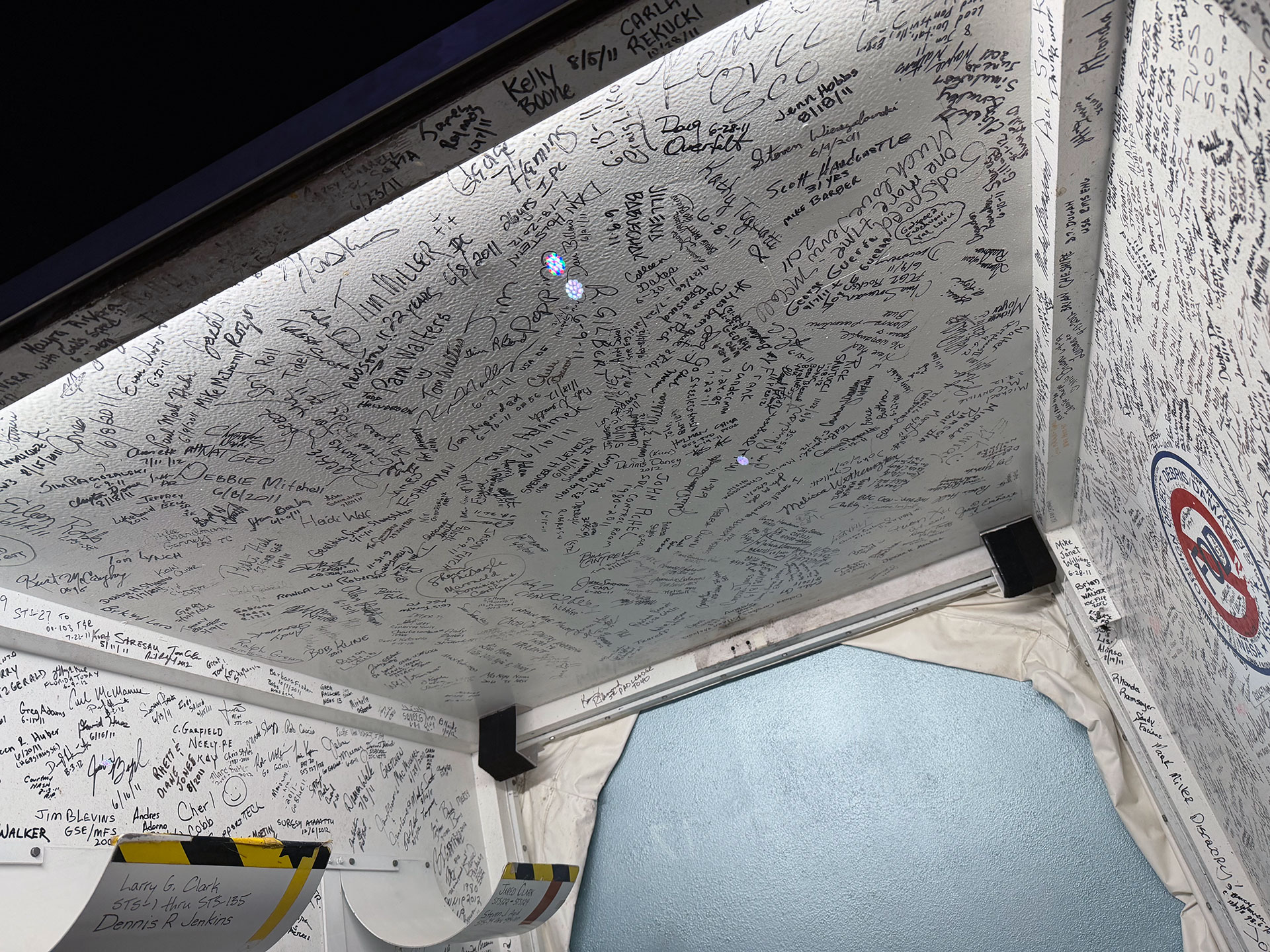 "Some of the more recognizable signatures are from the astronauts," said Clark, who signed the wall years before he became responsible for its fate. "One of the more impressive autographs is from Tom Stafford, who flew on Gemini 6, Gemini 9, Apollo 10 and the Apollo- Soyuz Test Project. Walt Cunningham from the Apollo 7 crew signed, as did Rick Hauck, who was the commander for the return to flight after the Challenger tragedy."