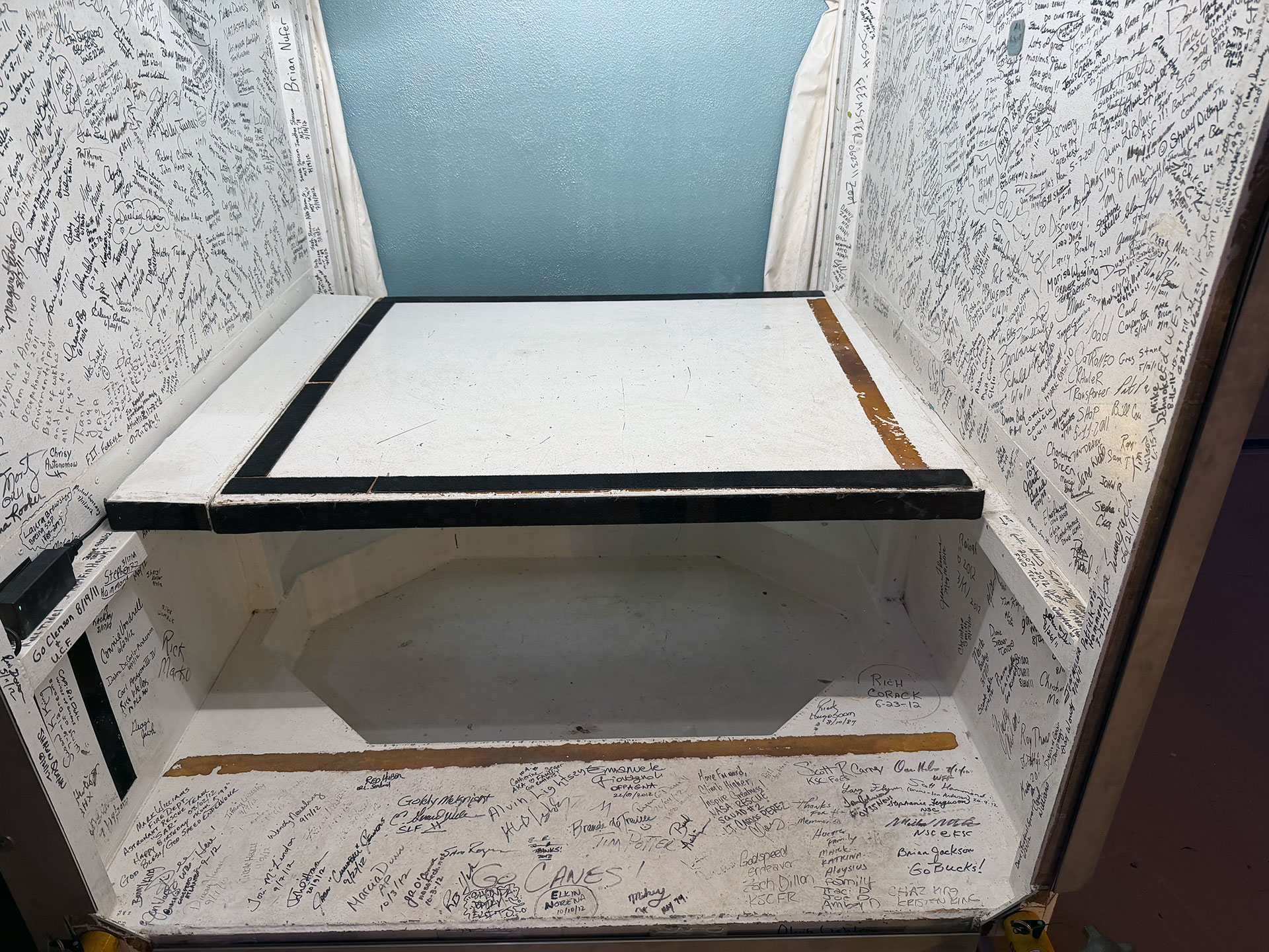 The Pima Air and Space Museum in Tucson, Arizona now displays the crew module access (or white room) tunnel from Orbiter Processing Facility-2 (OPF-2) at the Kennedy Space Center in Florida. During its last few years of service, the tunnel's walls were signed by astronauts, engineers, technicians, members of the press and special guests as both an "I was here" and farewell testament to the space shuttle program.
