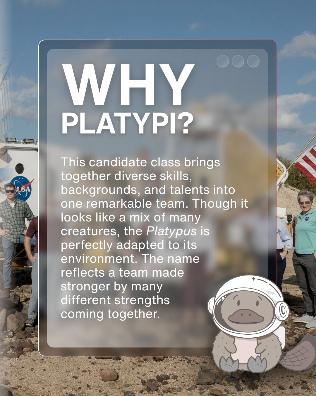 "The Platypus is perfectly adapted to its environment," read a NASA meme posted to social media about the new class. "The name reflects a team made stronger by many different strengths coming together."