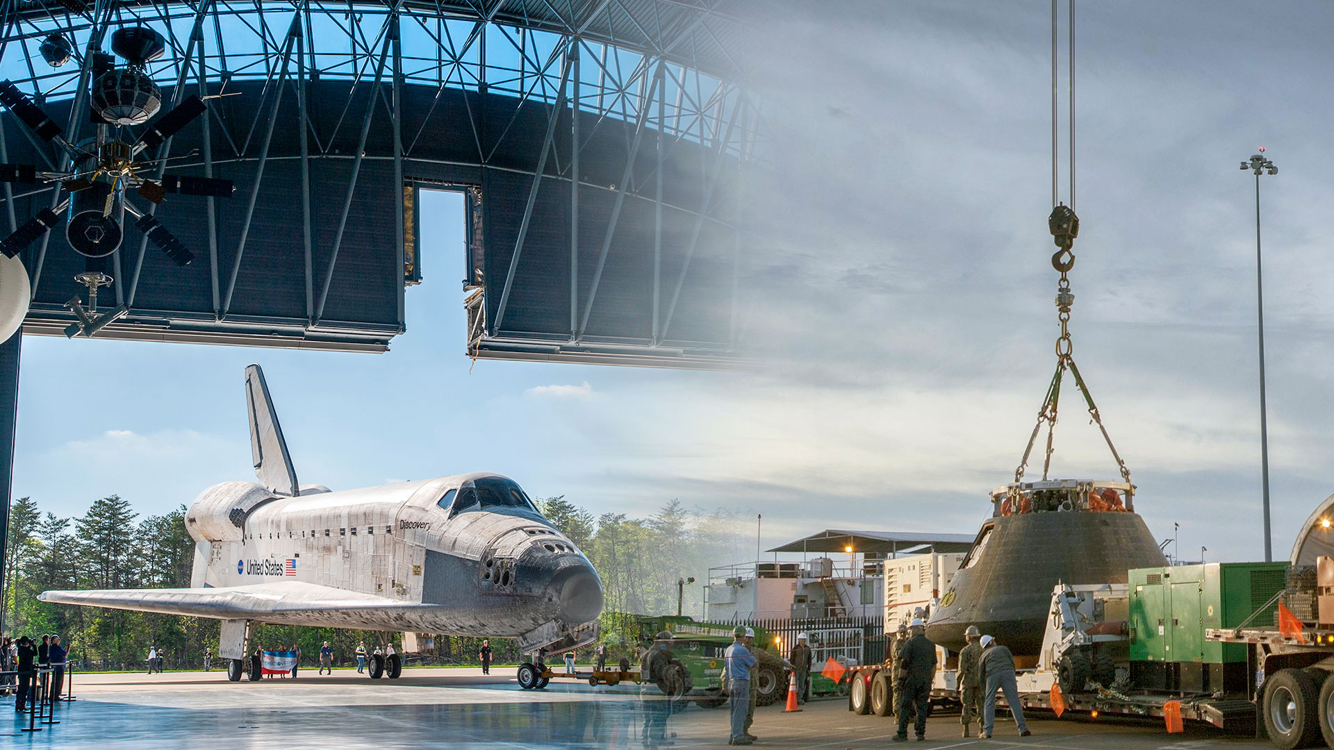 NASA has issued a draft request for proposals on how to move its historic flown space vehicles, from a large space shuttle orbiter like Discovery seen being rolled into the Smithsonian National Air and Space Museum's Steven F. Udvar-Hazy Center in 2012, to smaller capsules like Orion, seen being lowered onto a transport fixture at the naval base in San Diego, California in 2014. (collectSPACE/Ben Cooper / NASA/Cory Huston)