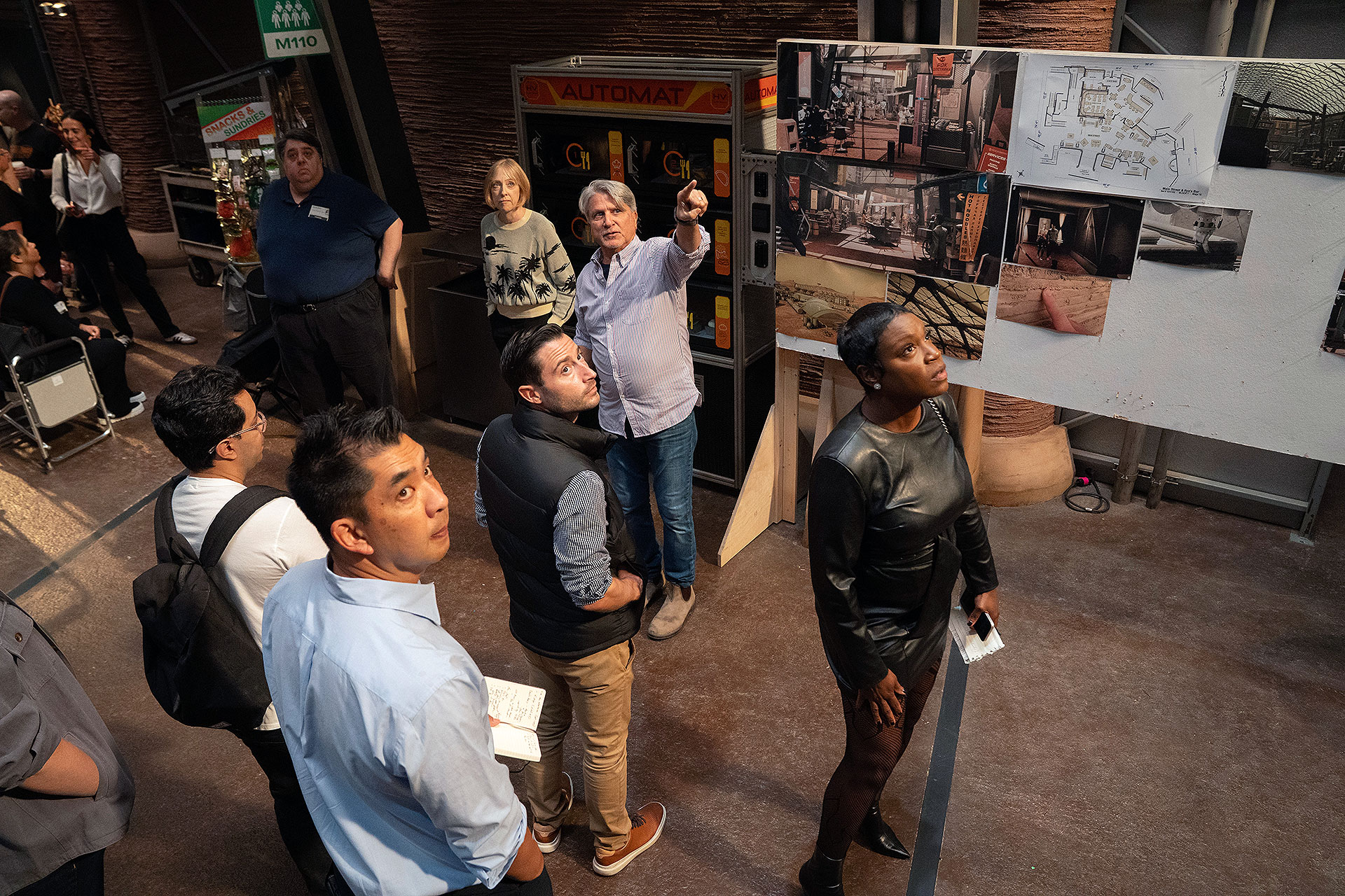 "For All Mankind" Season 5 production designer Seth Reed (at right, pointing upwards) and set decorator Lisa Clark (behind Reed) lead press through the Happy Valley marketplace. (Apple TV)