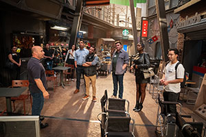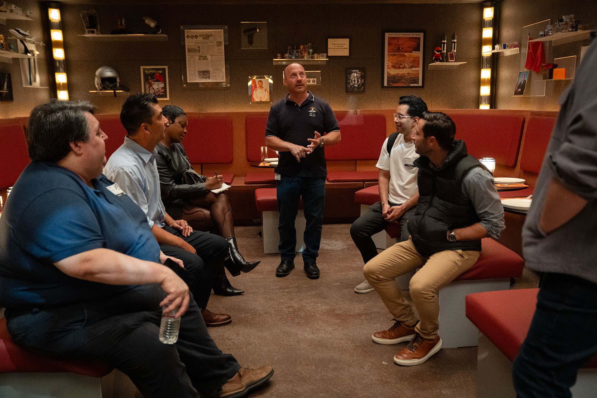 "For All Mankind" technical advisor Garrett Reisman (fourth from left), a former NASA astronaut, shares stories in Ilya's Bar and Restaurant, as created for season five of the series. (Apple TV) |
