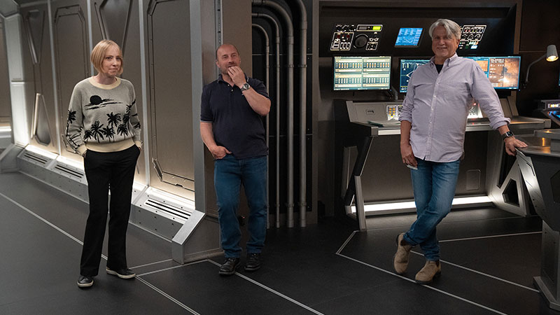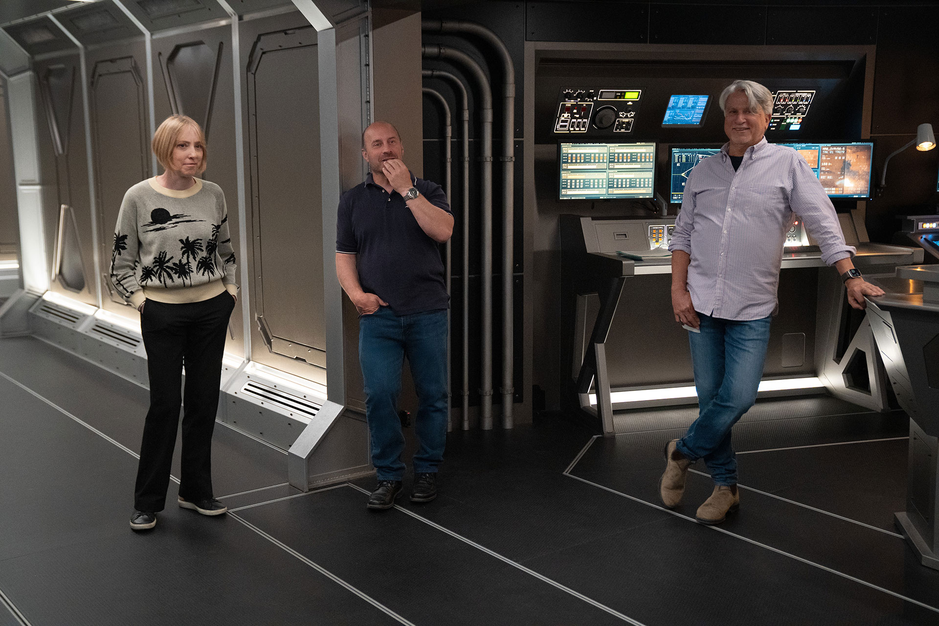 Set decorator Lisa Clark (left), technical advisor Garrett Reisman (center) and production designer Seth Reed on the "For All Mankind" set. (Apple TV) |