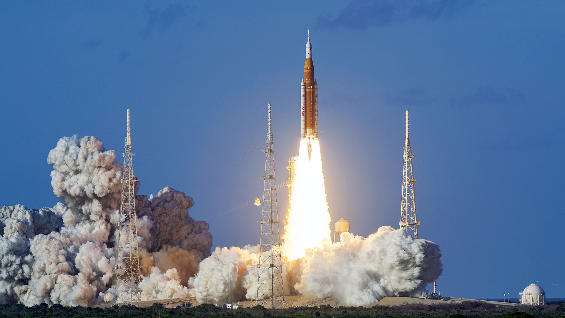 Climbing into the pre-sunset sky on a bright billowing plume, the scene evoked the long-past Apollo launches, yet the SLS resembles more closely the space shuttles that followed. Integrity's ride into Earth orbit included engines and side-mounted boosters being reused one last time from the former space transportation system.