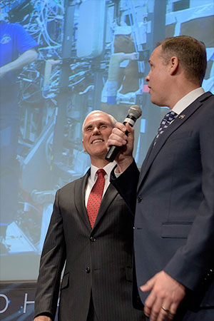 Vice President Mike Pence looks on as NASA's new administrator Jim Bridenstine speaks with astronauts Drew Feustel, Scott Tingle and Ricky Arnold on the space station. (NASA/Bill Ingalls)