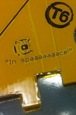 A close-up of the laser-engraved "Wheatley" and inscription "In spaaaaaaace!" now making its way to the space station. (Valve)