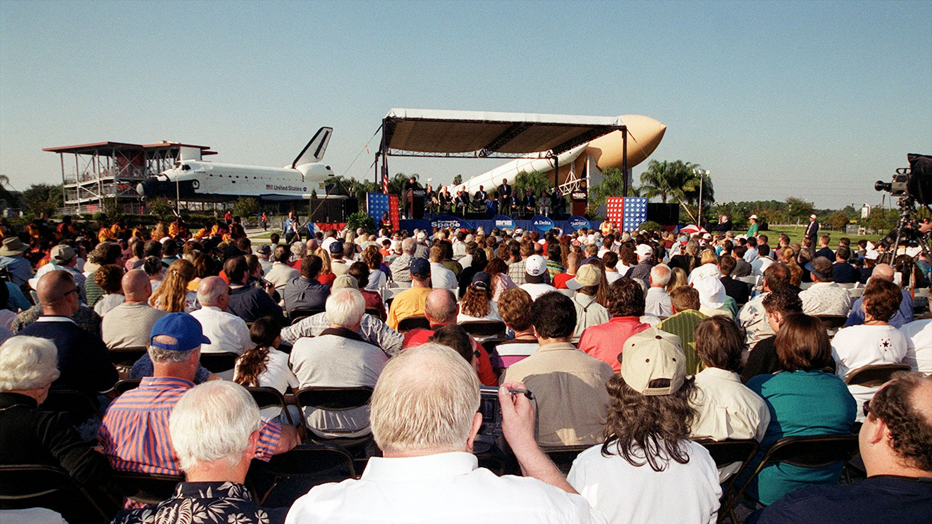 A large crowd is gathered at the Kennedy Space Center Visitor Complex to see the induction of the first space shuttle astronauts into the U.S. Astronaut Hall of Fame on Nov. 10, 2001. (NASA)