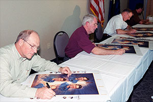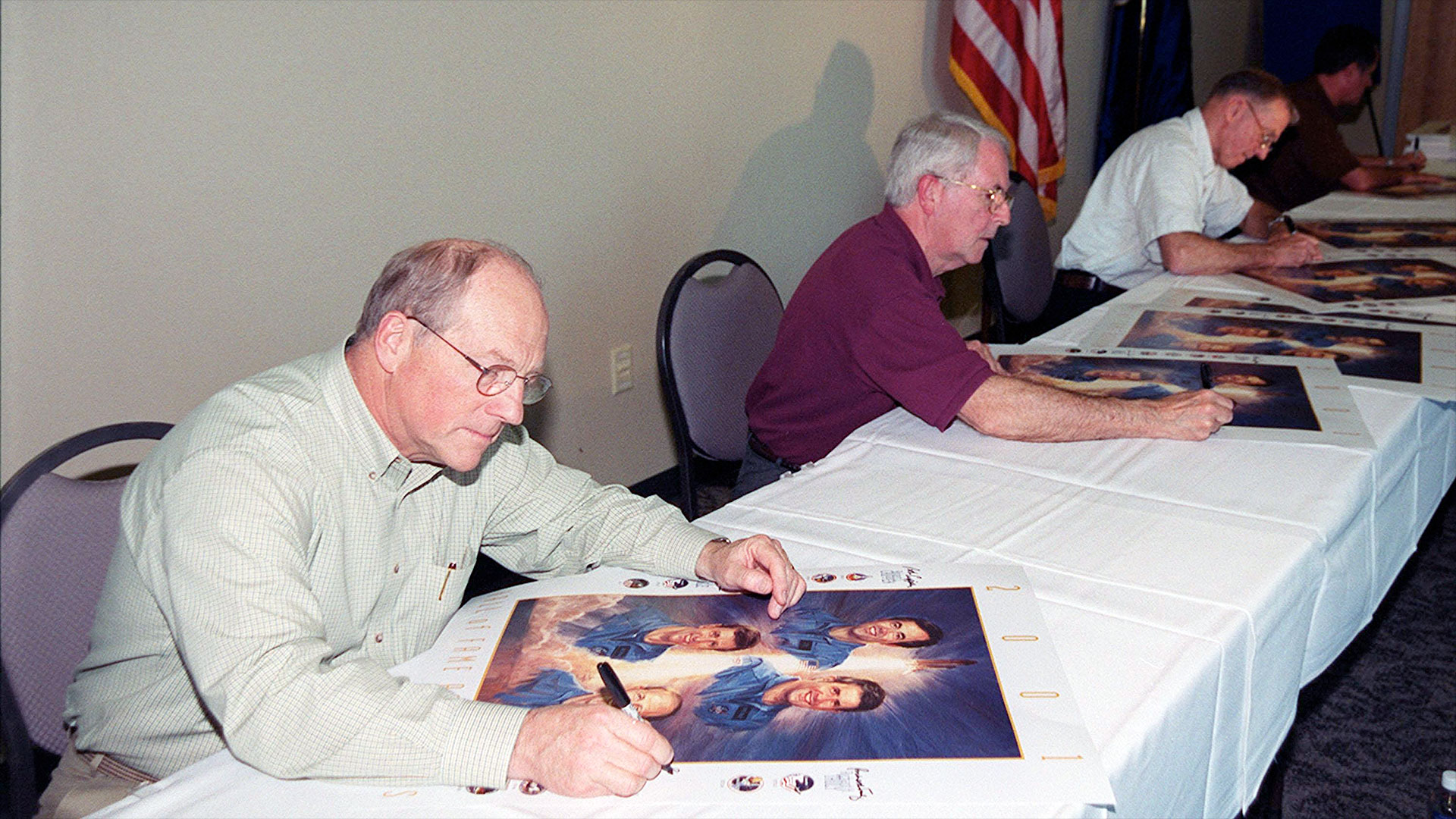 The first space shuttle class autographs posters commemorating their induction into the U.S. Astronaut Hall of Fame. (NASA) |