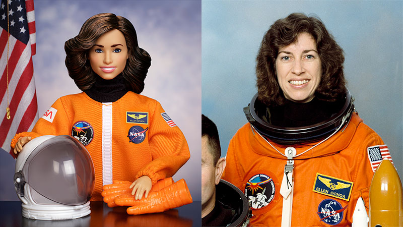 Mattel has introduced the Barbie Signature Inspiring Women Ellen Ochoa doll, modeled after the first Hispanic woman to fly in space. (Mattel/NASA [montage by collectSPACE])