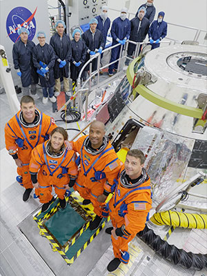 The Artemis II crew (from the right): Reid Wiseman, Victor Glover, Christina Koch and Jeremy Hansen pose in front of their Orion spacecraft, which they have named "Integrity." (NASA/Rad Sinyak)