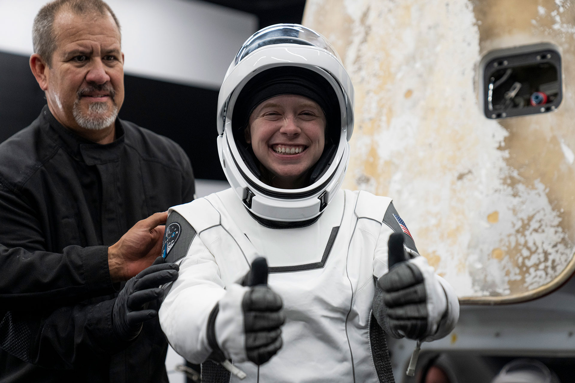 Hayley Arceneaux, still wearing her SpaceX pressure suit, gives a thumbs up after landing from three days in space in 2021. (SpaceX)