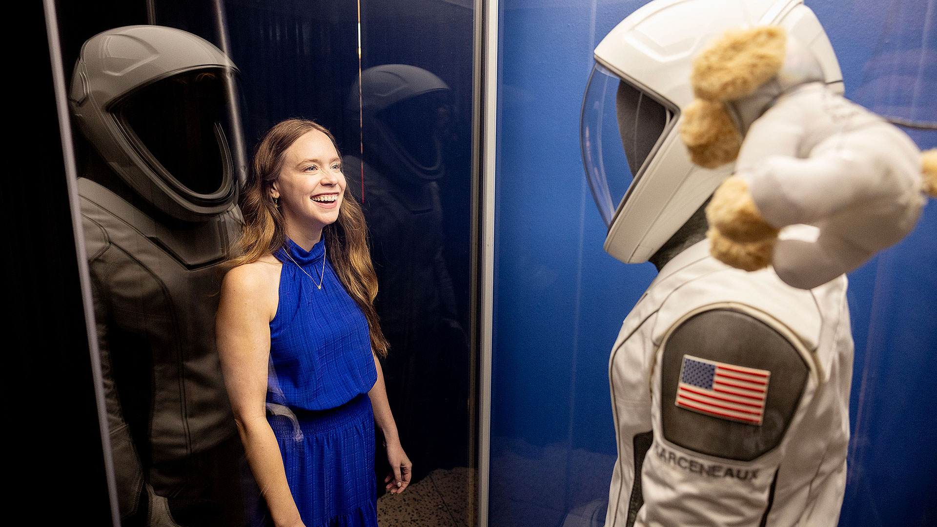 Pediatric cancer survivor and physician's assistant Hayley Arceneaux views her Inspiration4 pressure suit and zero-g indicator hours before they went on display at St. Jude Children's Research Hospital in Memphis, Tennessee on Tuesday, Oct. 7, 2025. (St Jude/ALSAC) |