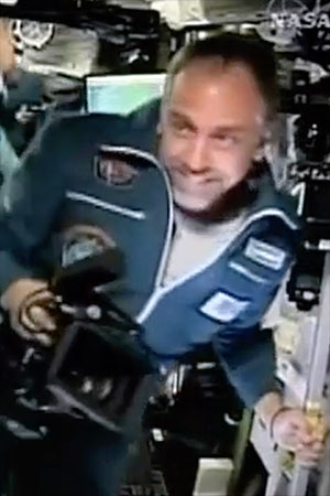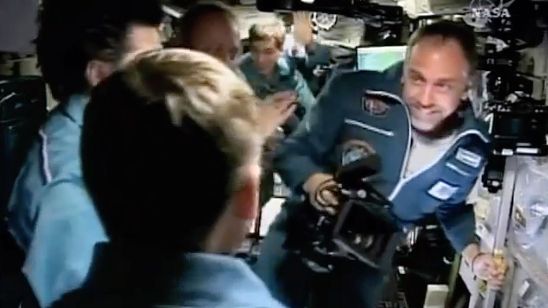 Richard Garriott arrives on-board the space station. (NASA TV)