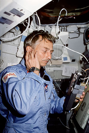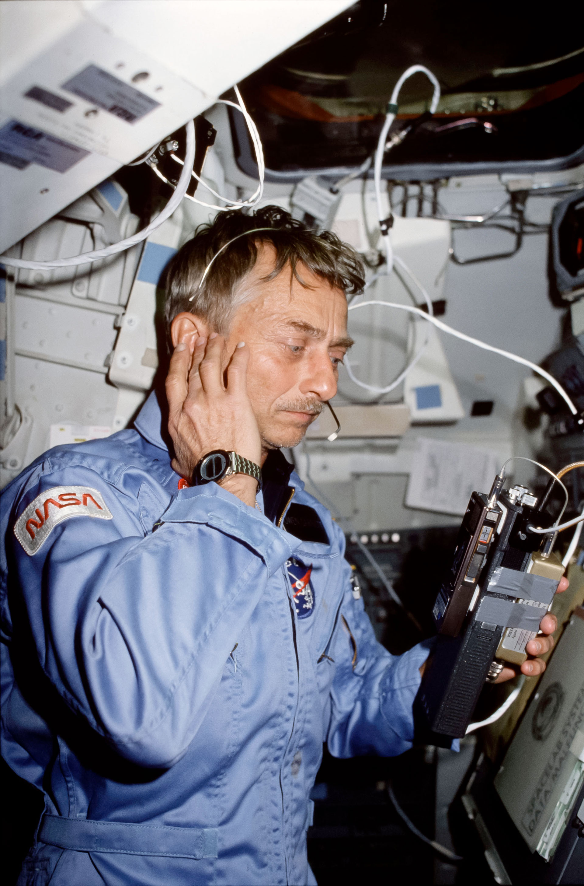 Owen Garriott operates a handheld ham radio on STS-9. (NASA)