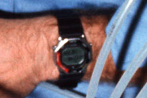 STS-5 pilot Bob Overmyer wore a red and black Seiko Sports 100 digital watch on space shuttle Columbia in November 1982. (NASA) |