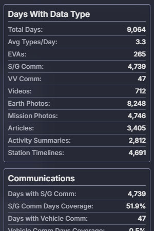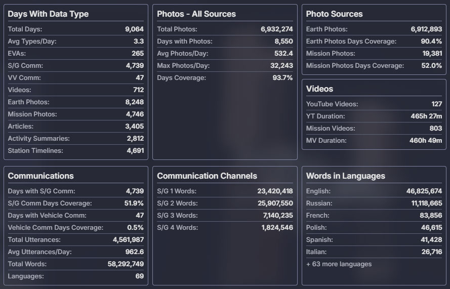 As an info box on the front page of ISS in Real Time tallies, at its debut the site contained mission data for 9,064 days out of the 9,131 (99.32% coverage); 4,739 days with full space-to-ground audio coverage; 4,561,987 space-to-ground comm calls in 69 languages; 6,931,369 photos taken in space over 8,525 days; 10,908 articles across 7,711 days; and 930 videos across 712 days.