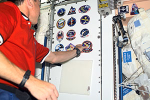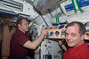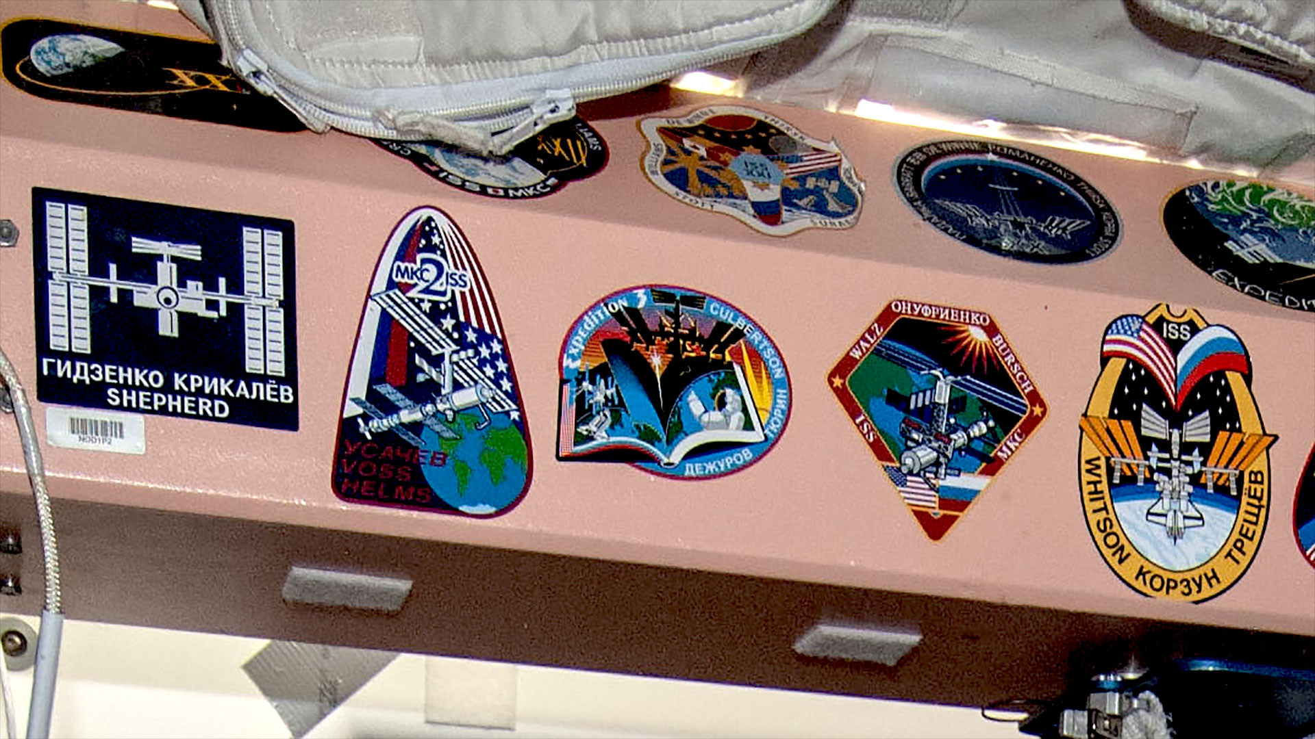 Rather than mix the visiting and resident crews, Voss, Helms and Usachev chose a different area for the expedition stickers to be added. The decals were affixed to a salmon-colored beam above the hatchway that would eventually lead into Node 3 ("Tranquility"), once it arrived during Expedition 22 in 2010.
