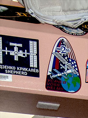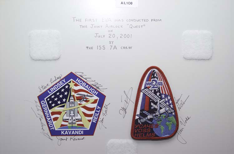 "The first EVA was conducted from the joint airlock 'Quest' on July 20, 2001, by the ISS 7A crew," read the inscription. Below that are an STS-104 decal and an embroidered Expedition 2 patch with the autographs of Steve Lindsey, Charles Hobaugh, Jim Reilly, Janet Kavandi, Mike Gernhardt, Voss, Helms and Usachev.