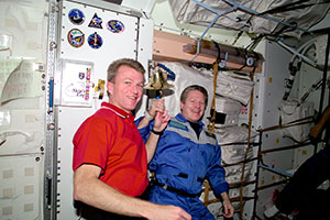 The Expedition 1 crew, including commander William Shepherd (pictured, on right) did not add their insignia to the International Space Station's walls, though visiting space shuttle astronauts had established the tradition. (NASA)