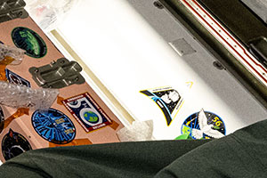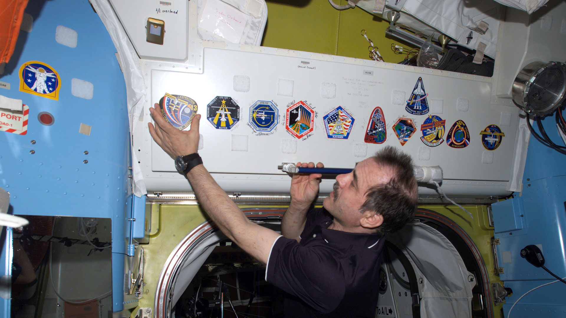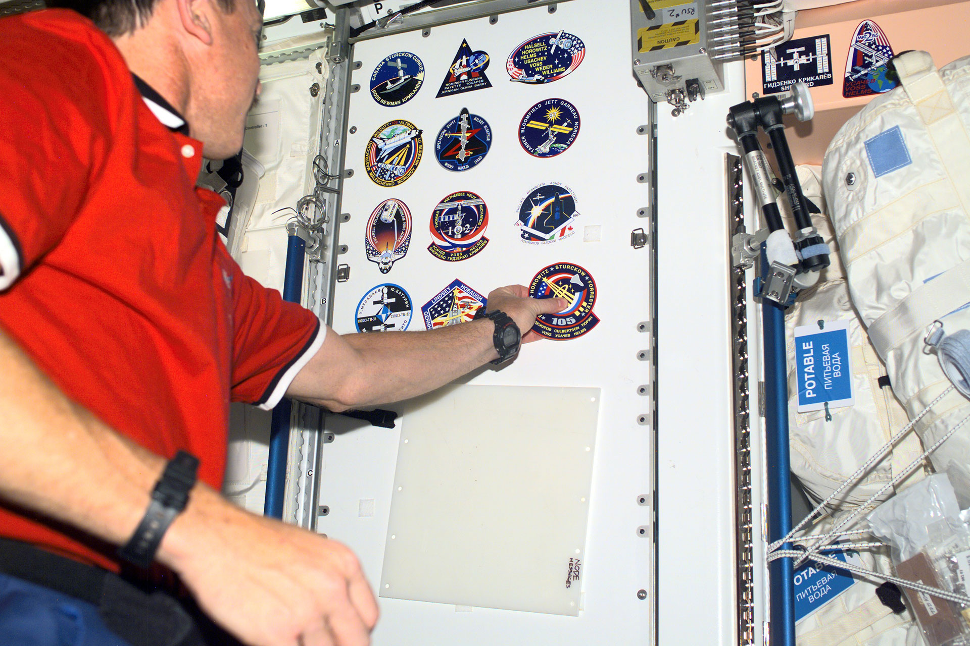 The STS-105 crew, including commander Scott Horowitz (pictured), delivered to the International Space Station the Expedition 1 and 2 decals (at upper right), which were added by the Expedition 2 crew before they departed the station with the 105 crew on space shuttle Atlantis in August 2001. (NASA)