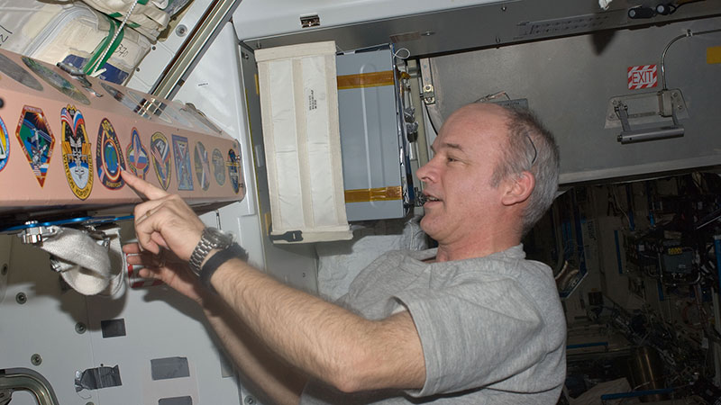 Expedition 22 commander Jeff Williams looks at the various mission insignias placed in the Unity node of the International Space Station after placing the Expedition 22 insignia among them in March 2010. (NASA)
