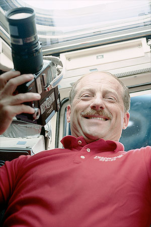 Astronaut Rick Hauck, STS-26 commander, on space shuttle Discovery's flight deck, with one of the many cameras carried on board to document planet Earth in October 1988. (NASA)