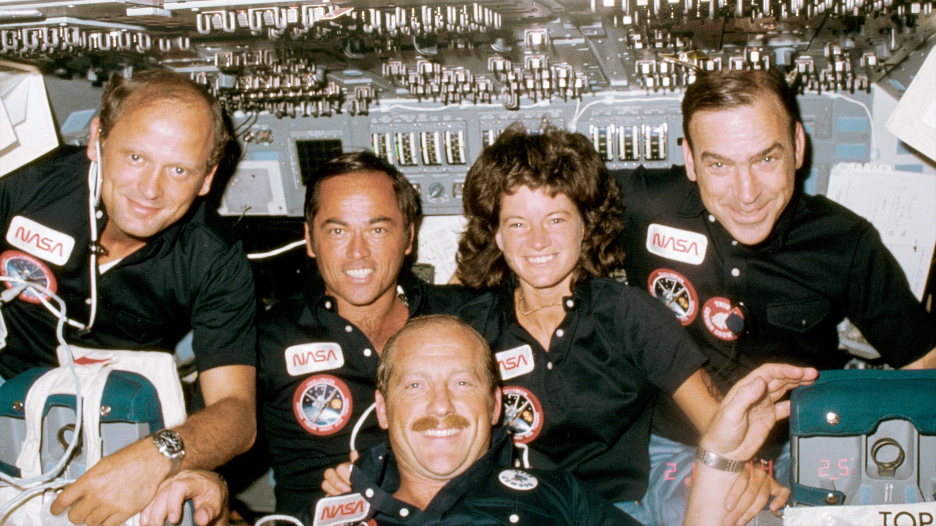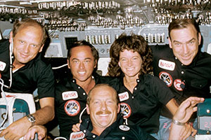 Pilot Rick Hauck (center) with his STS-7 crewmates Norm Thagard, Bob Crippen, Sally Ride and John Fabian on the flight deck of the space shuttle Challenger in June 1983. (NASA)