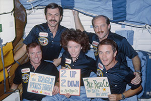 Commander Rick Hauck (at top right) with his STS-51A "space salvage" crewmates David Walker, Dale Gardner, Anna Lee Fisher and Joe Allen on space shuttle Discovery's middeck. (NASA)