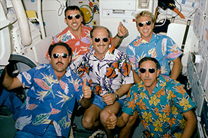 Commander Rick Hauck (at center) with his STS-26 crewmates Mike Lounge, David Hilmers, Pinky Nelson and Dick Covey in their Hawaiian shirts on space shuttle Discovery's flight deck. (NASA)