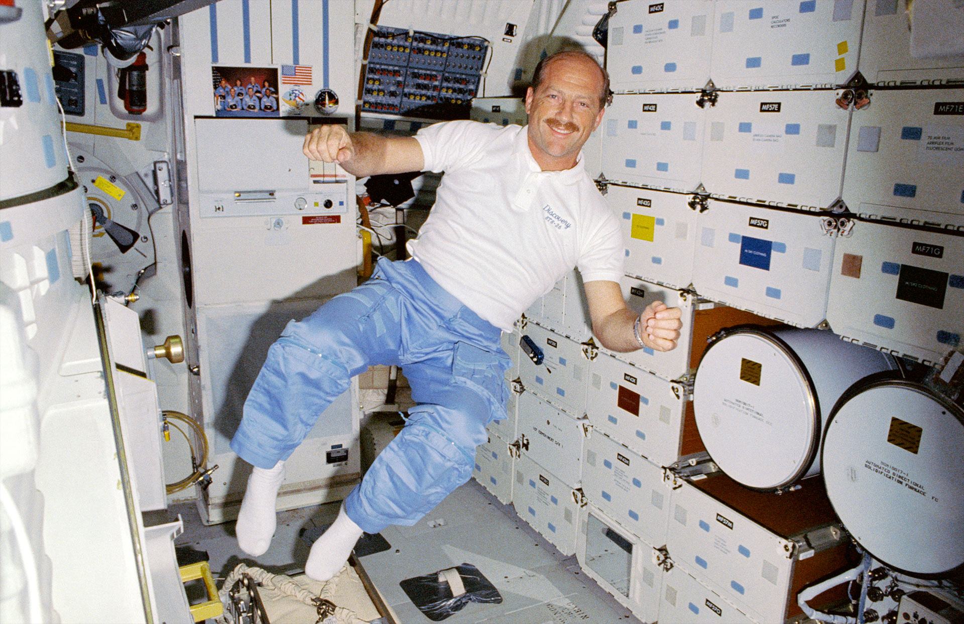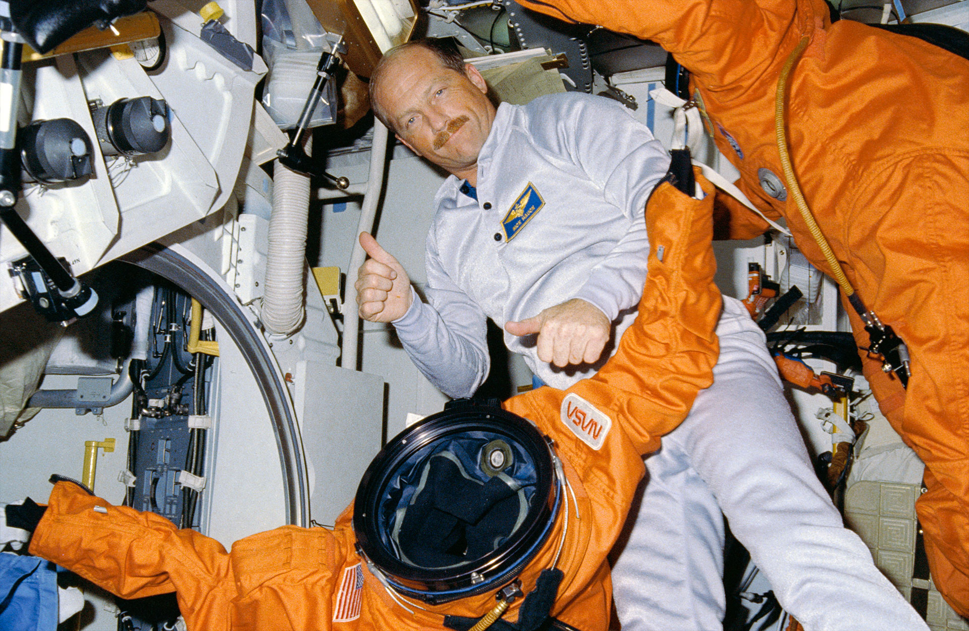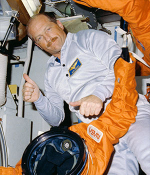 For nearly eight days, Hauck, David Walker, Joe Allen, Anna Lee Fisher and Dale Gardner carried out the mission's goals, including conducting two spacewalks that featured the last use the Manned Maneuvering Unit (MMU) tetherless jetpacks.