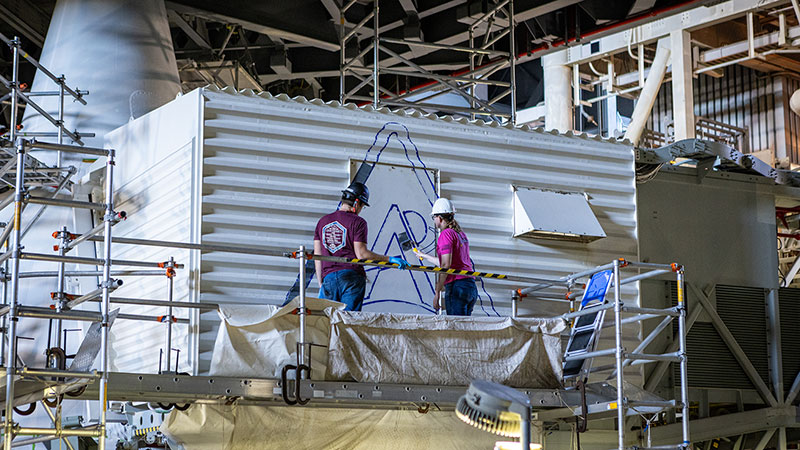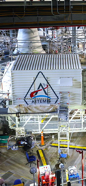 McCrary and Mortensen were supported while painting by scaffolding that was erected on one of the highest support platforms in High Bay 3 of the Vehicle Assembly Building (VAB) at NASA's Kennedy Space Center in Florida. The logo was added after NASA completed stacking the SLS and Orion for the Artemis II mission (as well as adding its own specially-painted logos).