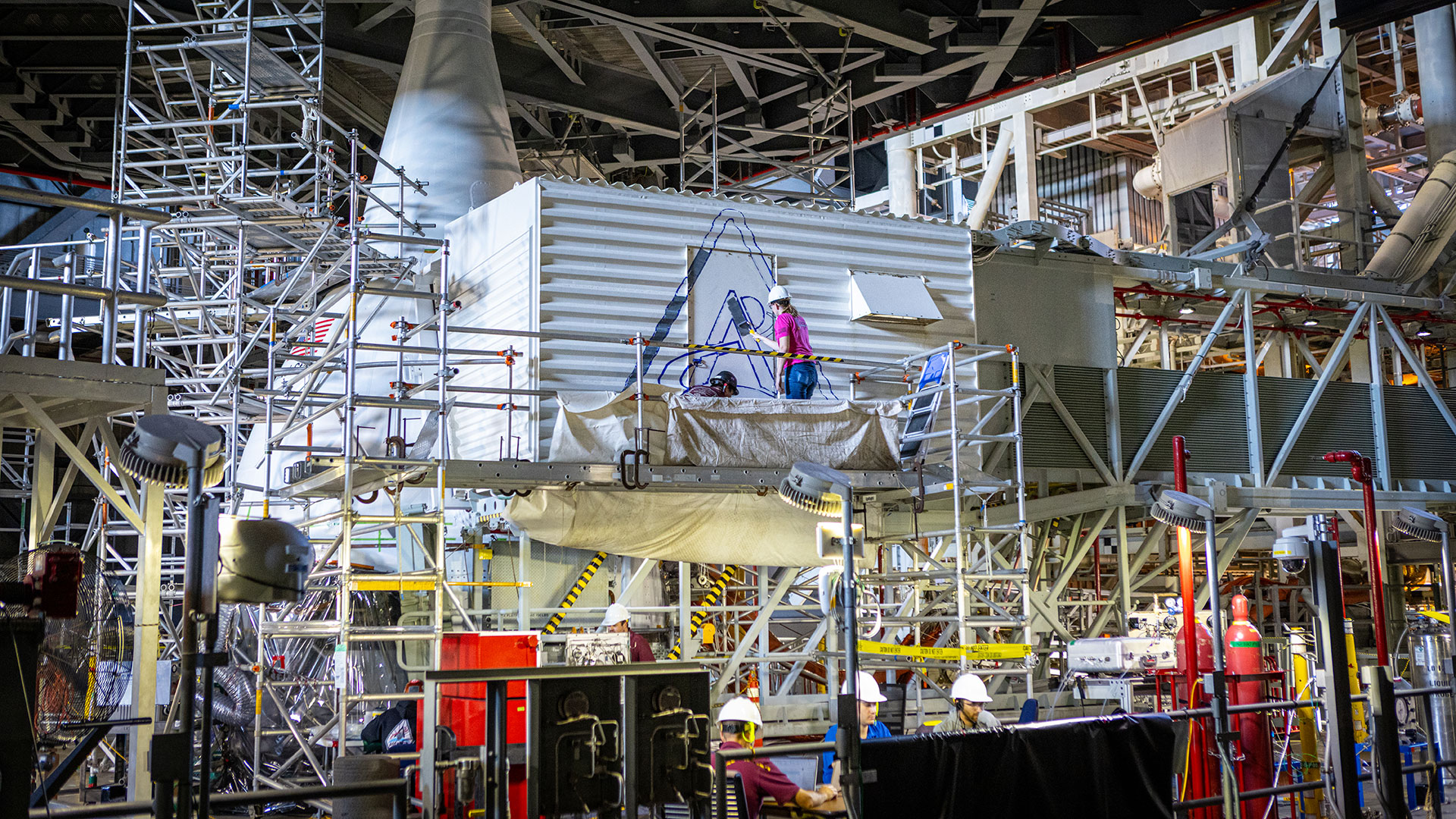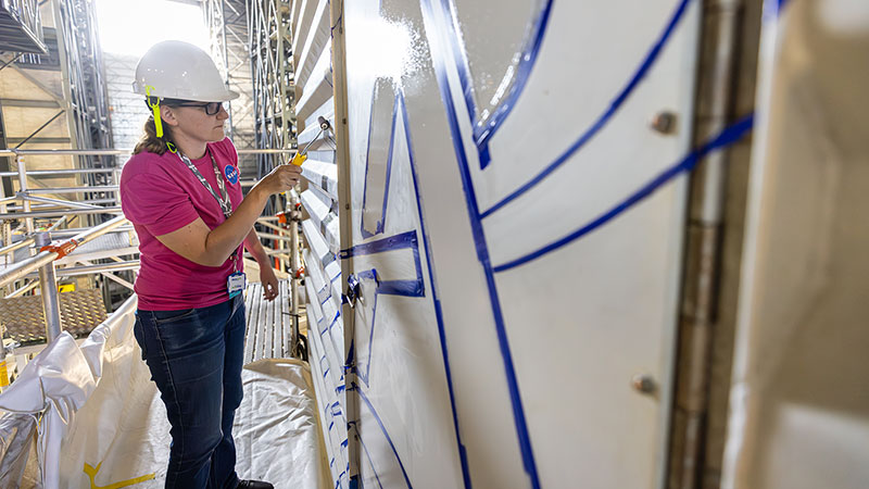 Mechanical engineering tech Katie Mortensen paints NASA’s Artemis logo on the program's crew access arm white room. (NASA/Frank Michaux)